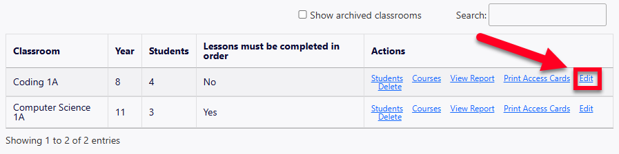 By default, Zenva Schools hides archived classes. To display archived classes, check the "Show archived classrooms" box above the classroom data table. The table will then display the classroom name(s) in a semi-transparent font and mark them as "(Archived)" to help differentiate them from currently active classes.