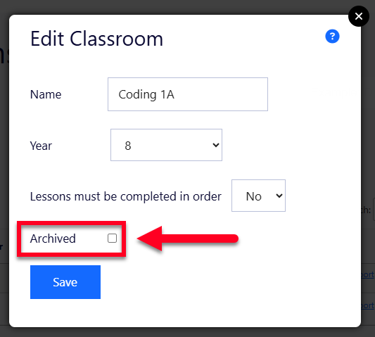 - On the Classroom Details pop-up window, check the Archived box. Then click save.